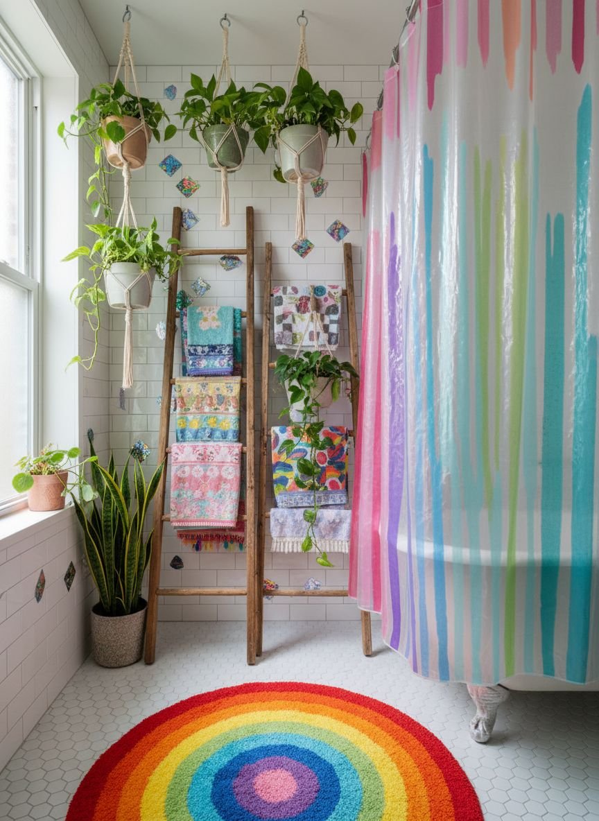 The shower floor is often an overlooked opportunity for design, but colorful mosaic tiles can turn it into the hero of the bathroom. By using a mix of colors—perhaps a confetti blend of pinks, yellows, and whites—you create a playful and energetic foundation for the space. This is particularly effective in children’s bathrooms or guest baths where you can afford to be a bit more experimental. The visual noise of a colorful mosaic floor also hides soap scum and water marks incredibly well.