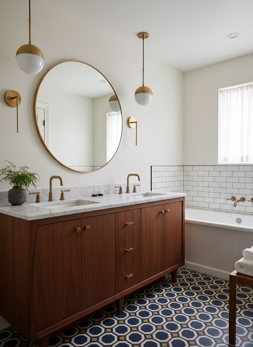 When choosing this style, you have the option of authentic cement tiles or porcelain reproductions. Porcelain is generally preferred for showers as it is non-porous and does not require the rigorous sealing routine of cement. The pattern itself acts as a camouflage for water spots and stray hairs, making it a practical choice for busy households. The black-and-white star pattern is classic, but navy and white or sage and cream offer a softer, more colorful alternative.