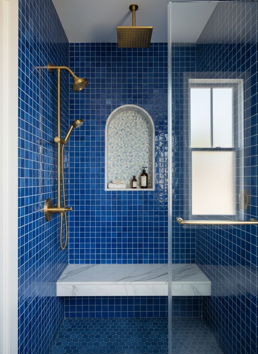 Sometimes you don’t need to tile the whole shower to make a statement. A blue mosaic accent—whether it is a vertical strip, a horizontal band, or the back of a recessed niche—adds a pop of color without the commitment of a full wall. This is a budget-friendly way to use expensive, high-end glass or stone mosaics. You get the visual impact of the luxury material but in a smaller quantity.