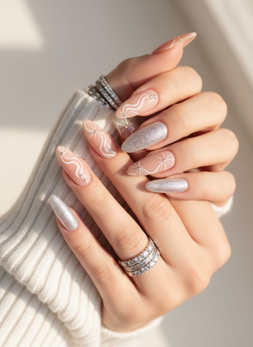 Despite the variety, keeping the color palette strictly white and silver makes it look cohesive, not chaotic. It is a fun, playful manicure that celebrates the season.