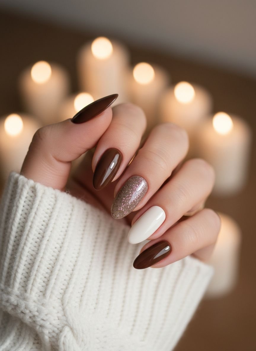 Cream & Milk Chocolate Nails w/ Glitter