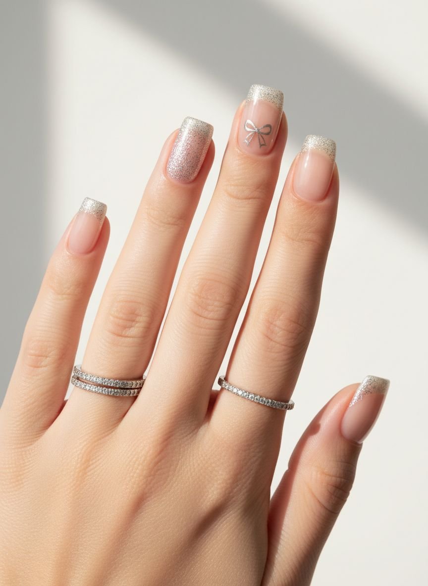 Combine the silver tip trend with the “balletcore” ribbon trend. Paint a classic silver French tip, then use a thin brush to draw a simple “X” or bow shape just below the tip in white or silver. It looks like your nails are wrapped like tiny gifts.