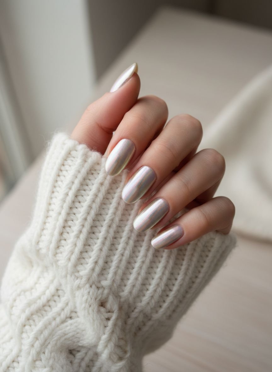 The “glazed donut” trend has evolved into this softer, creamier version perfect for cold weather. Vanilla chrome starts with a sheer, milky white base rather than a stark white or pink. The result is a pearlescent, ethereal glow that looks like moonlight hitting snow. It is subtle enough for the office but catches the eye whenever you move your hands.