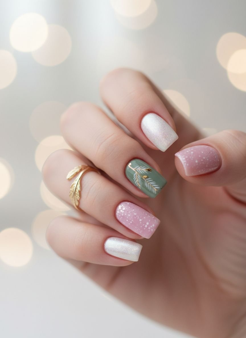 This is for the storyteller. Each nail features a different subtle element of winter: one solid white, one with a snowflake, one with silver glitter, one with a cable-knit texture (using 3D gel or thick polish).