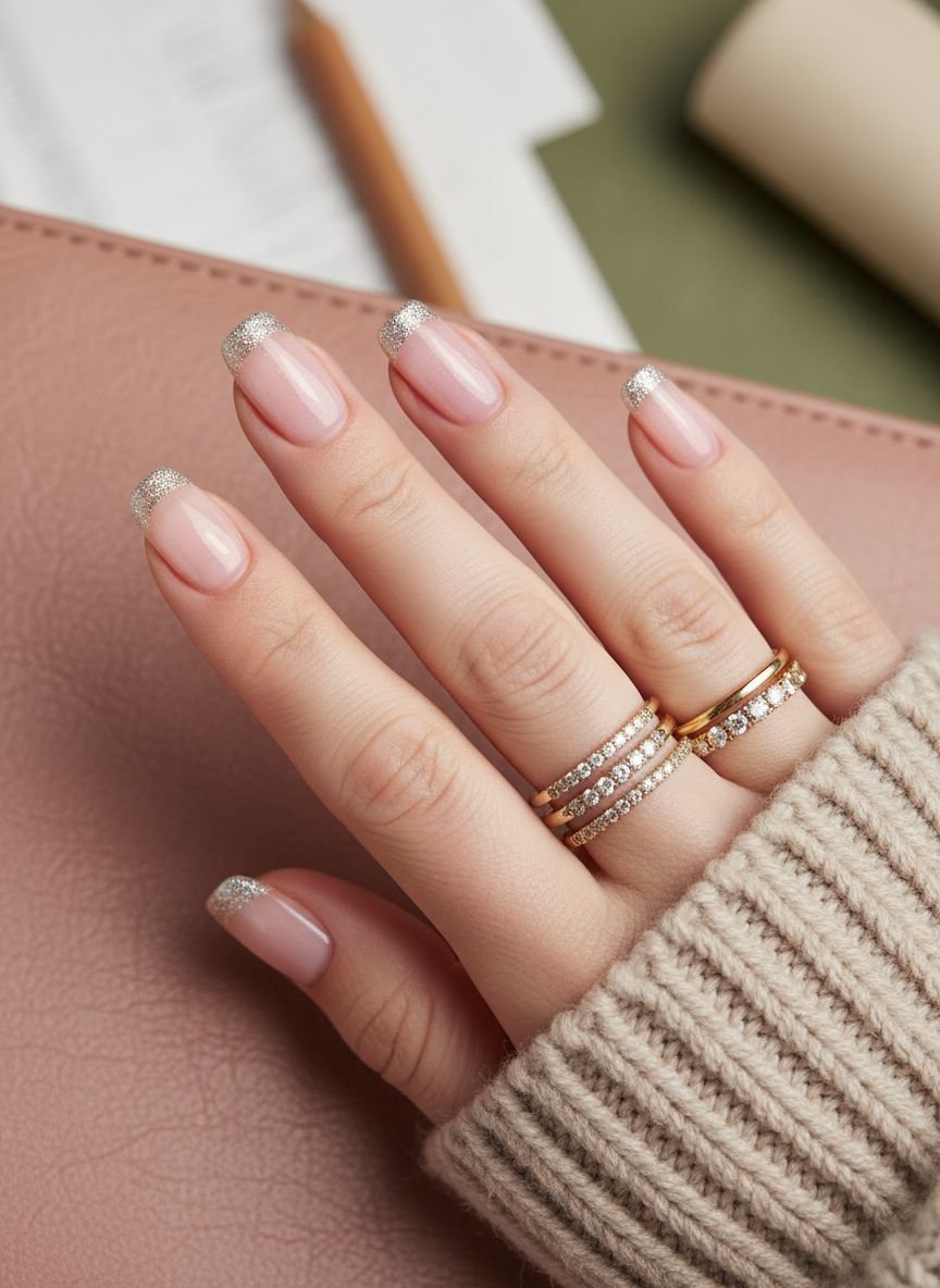 Instead of a solid line, this French tip is made of concentrated glitter. The glitter is dense at the free edge and fades slightly as it moves toward the nail bed. It is softer and more forgiving than a painted line.