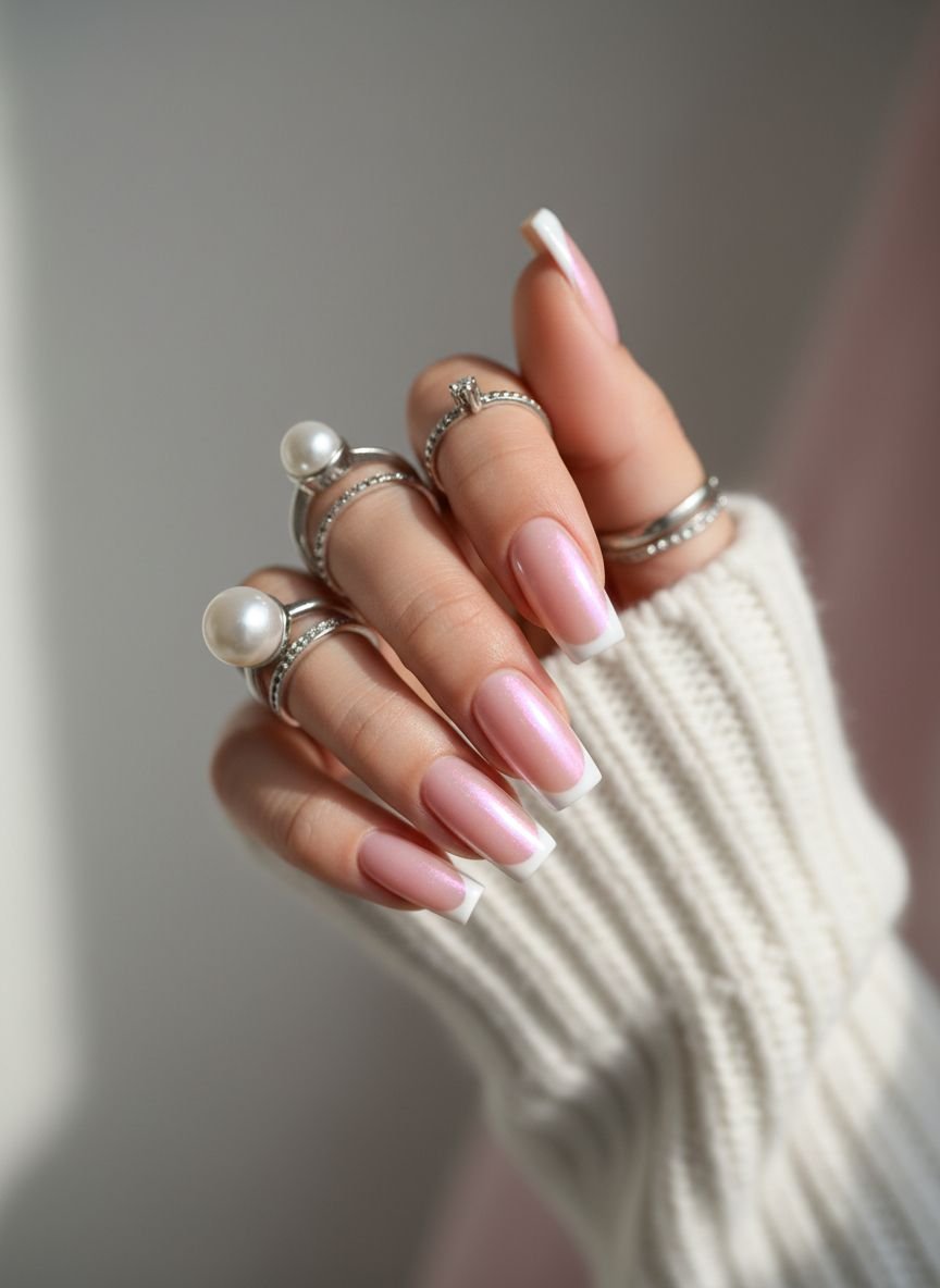 Why choose between two trends when you can combine them? This style takes the timeless French manicure and layers a translucent chrome powder over the top. The chrome veil softens the harsh white line, blending it slightly with the pink base for a dreamy, frosted look. It looks like your nails have been kissed by frost.