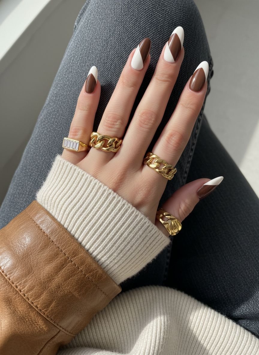 Contrast is a major design principle this year. This look alternates tips or combines them on a single nail for a graphic pop. You might see a brown French tip with a thin white outline, or a double French featuring both colors. The crisp white brightens the look, while the deep brown anchors it in the winter season.
