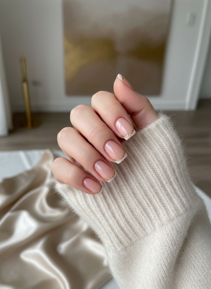 For the minimalist who loves a touch of luxury, this is the one. Instead of a thick band of color, this design features a micro-thin line of metallic gold right at the free edge of the nail. It is incredibly subtle, catching the light only at certain angles.