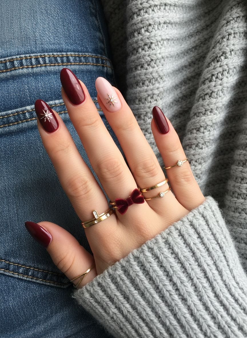 The “coquette” aesthetic meets winter glam. Deep, vampy reds—think oxblood or black cherry—replace the bright candy-apple reds of December. To lighten the mood, add dainty 3D bow charms or hand-painted silver ribbons. A scatter of loose glitter on an accent nail ties the look together.