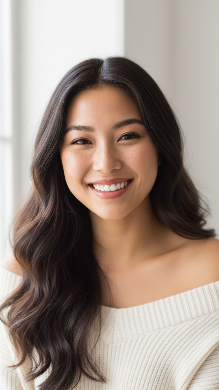 This long cut features bouncy, face-framing layers that start at the chin and cascade down. It creates that voluminous, “fluffy” look reminiscent of Cindy Crawford in the 90s. While it looks high-glamour, the cut itself is low maintenance because the layers grow out seamlessly. It removes bulk from thick hair, making it faster to dry. The movement is built-in, so you don’t need to be an expert with a round brush to get a good result.