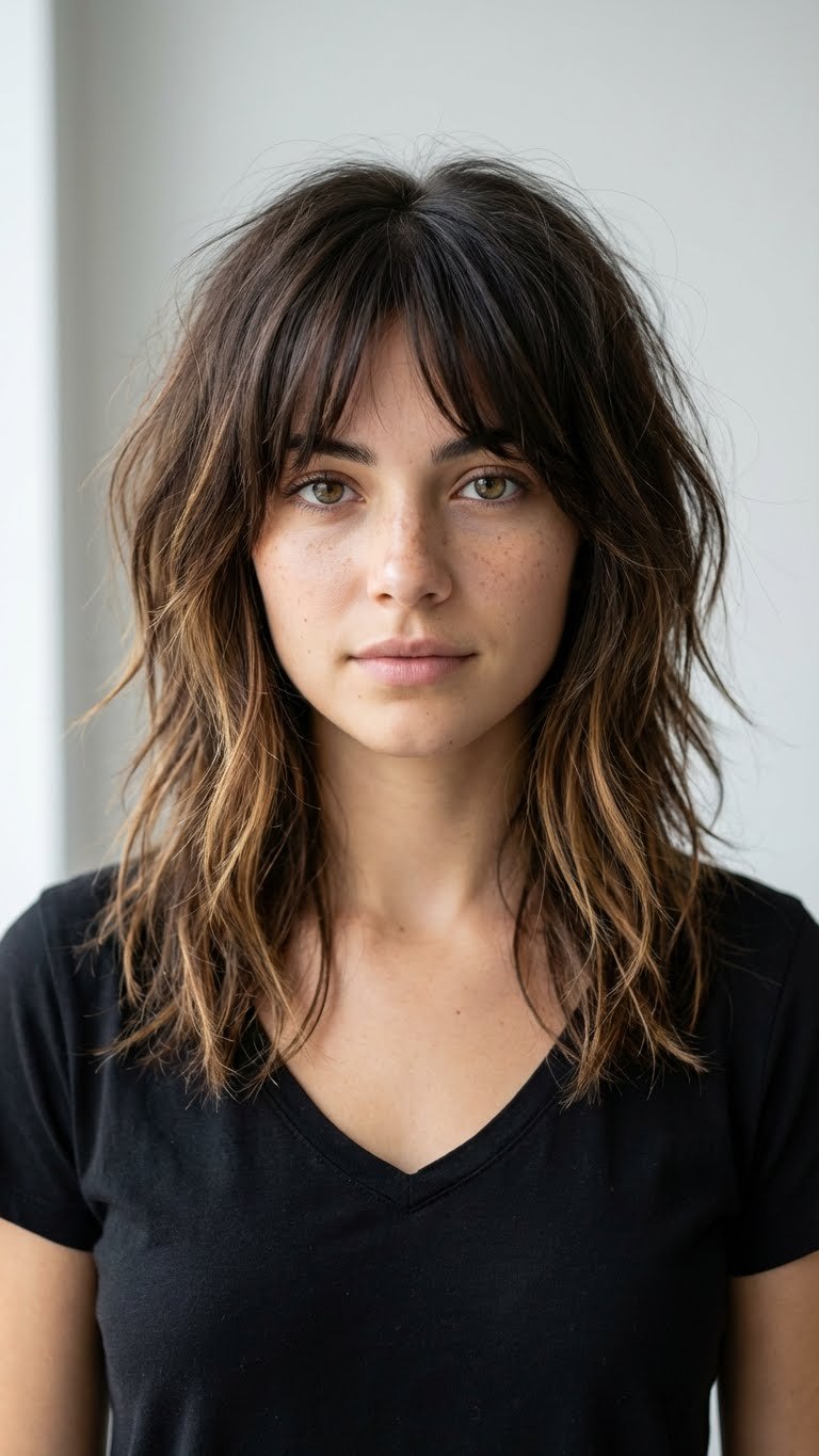 Combining the popular curtain bang with a shag cut creates a face-framing powerhouse. The bangs flow directly into the layers of the shag, creating a continuous line of movement. This style opens up the face and looks fantastic on medium to long hair. It gives a 70s retro vibe that is very on-trend for 2026. The layers remove bulk, making thick hair manageable.