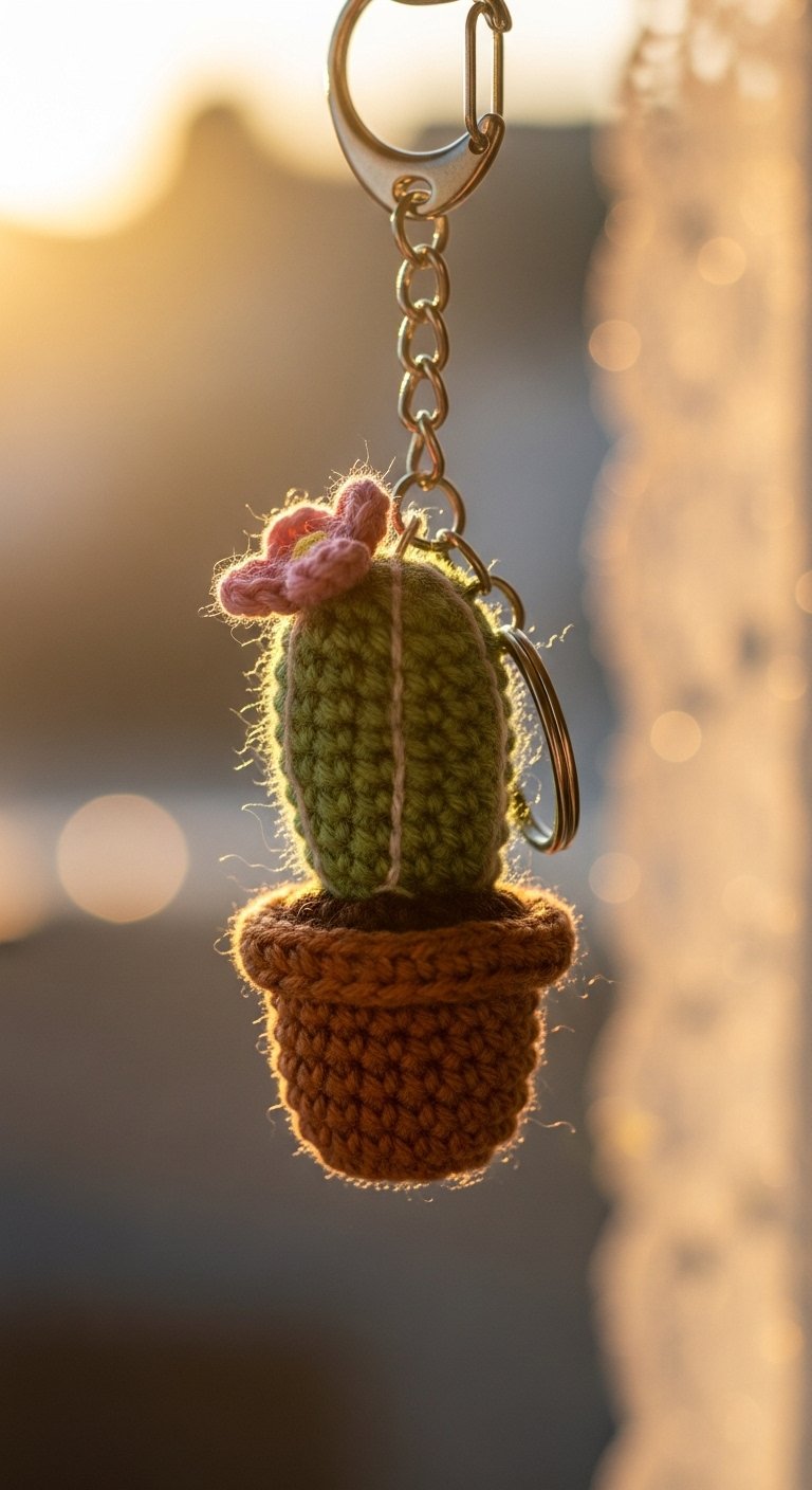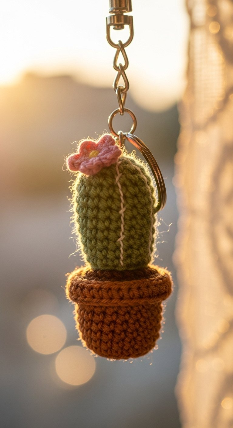 For those who cannot keep real plants alive, the crochet cactus is the perfect alternative. This keychain features a small green barrel shape, often with little “arms,” sitting inside a tiny crocheted pot. You can use embroidery to create the prickles without them actually being sharp.