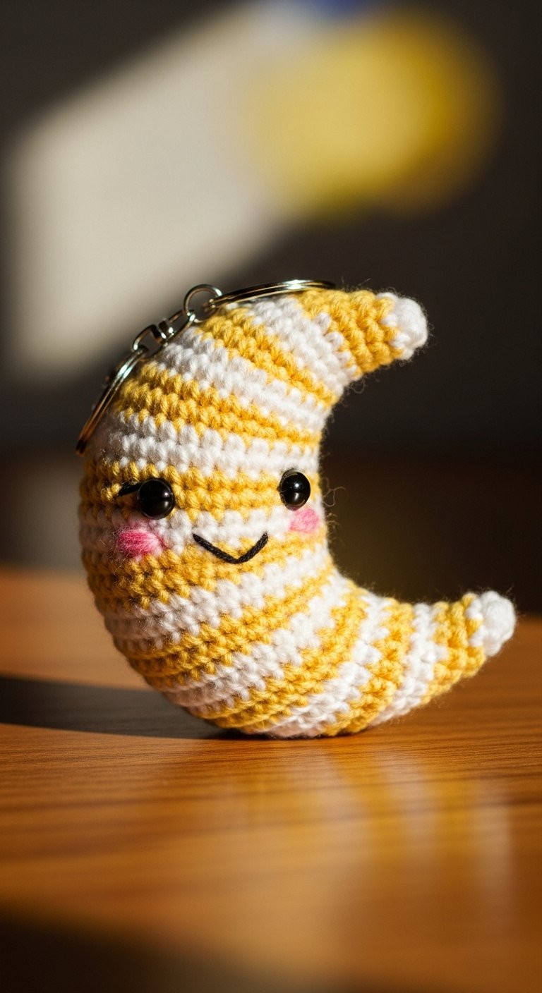 A crescent moon keychain is elegant and dreamy. You will crochet a tapered tube that curves into a “C” shape. Yellow, silver, or white yarns are standard, but a pale blue can also look lovely. It is a sleek shape that doesn’t take up much room in your pocket. You can embroider a sleeping face on it for extra charm. It pairs beautifully with the Star keychain (see #20) for a celestial set. It serves as a gentle reminder to dream big, even during the day.