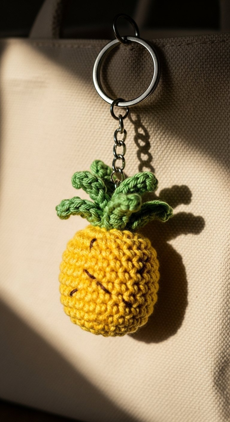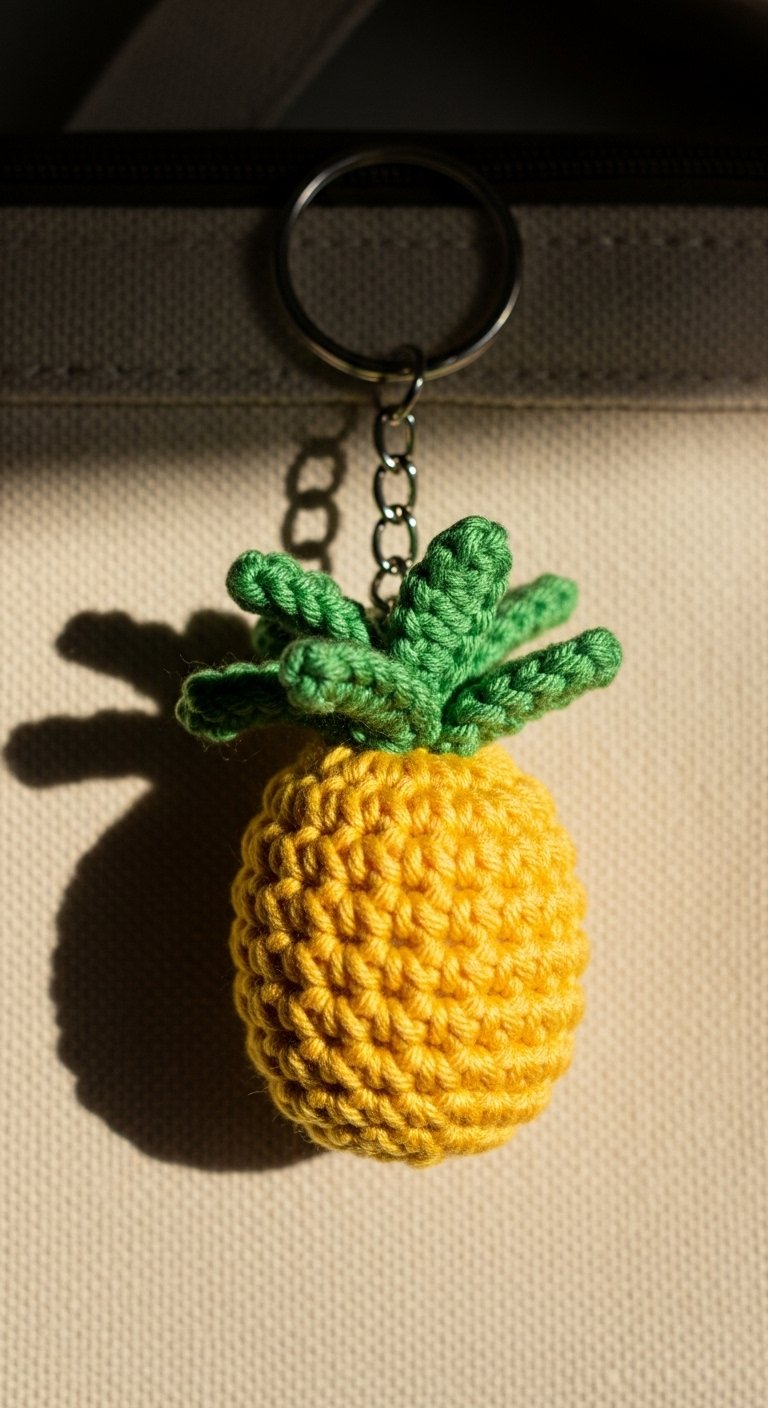 Bring some summer vibes to your keyring with a pineapple. This project uses a textured stitch, like the bobble stitch or puff stitch, to mimic the rough skin of the fruit. You will need bright yellow for the body and spiky green yarn for the crown.