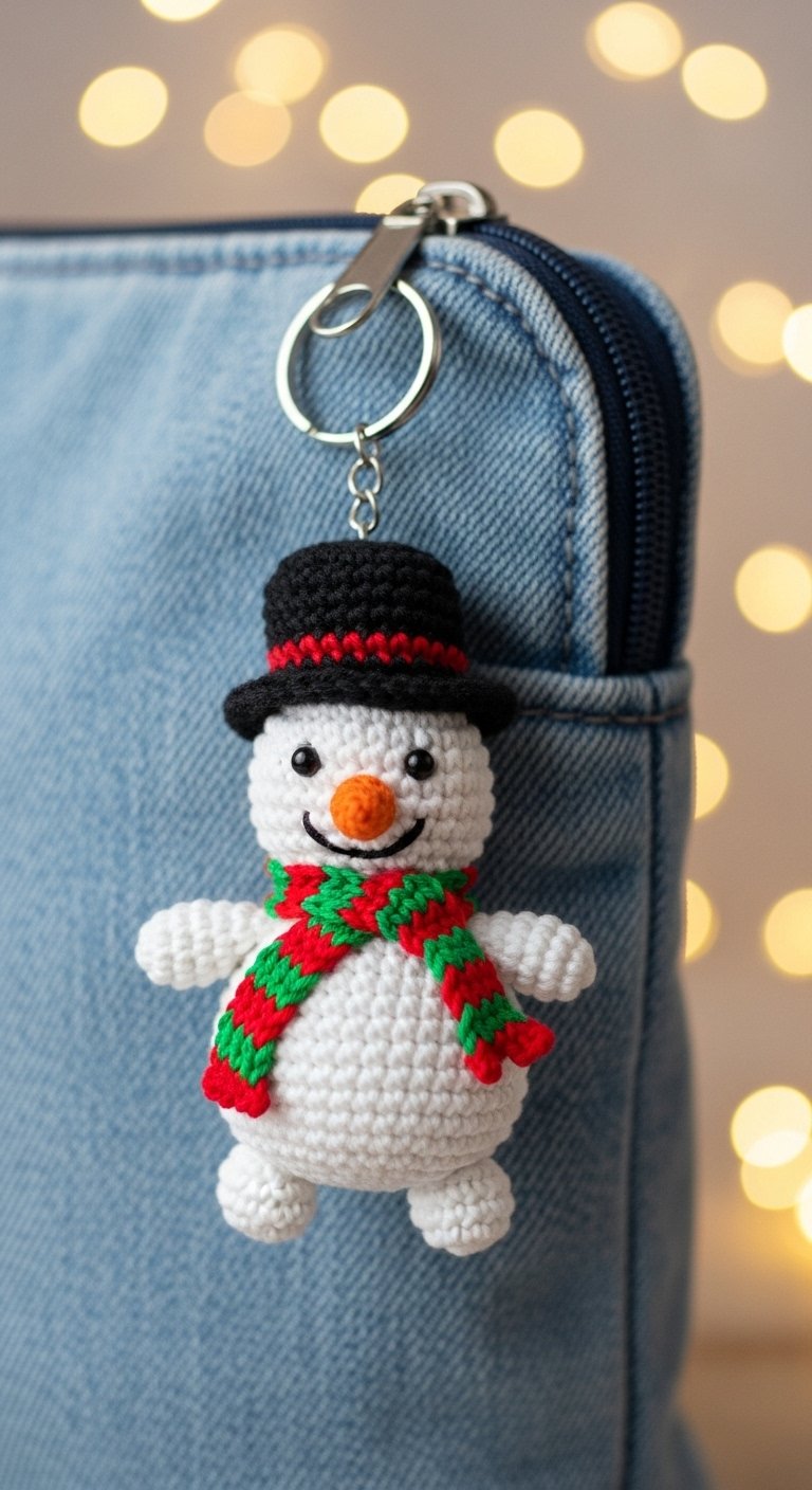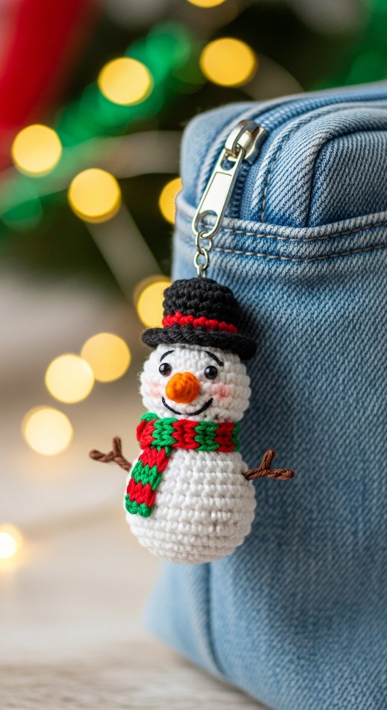 A stack of two or three white spheres creates your snowman. You can accessorize him with a tiny scarf made of scrap yarn and a little orange nose. It is a vertical design that looks adorable hanging from a backpack zipper. It captures the joy of winter fun.