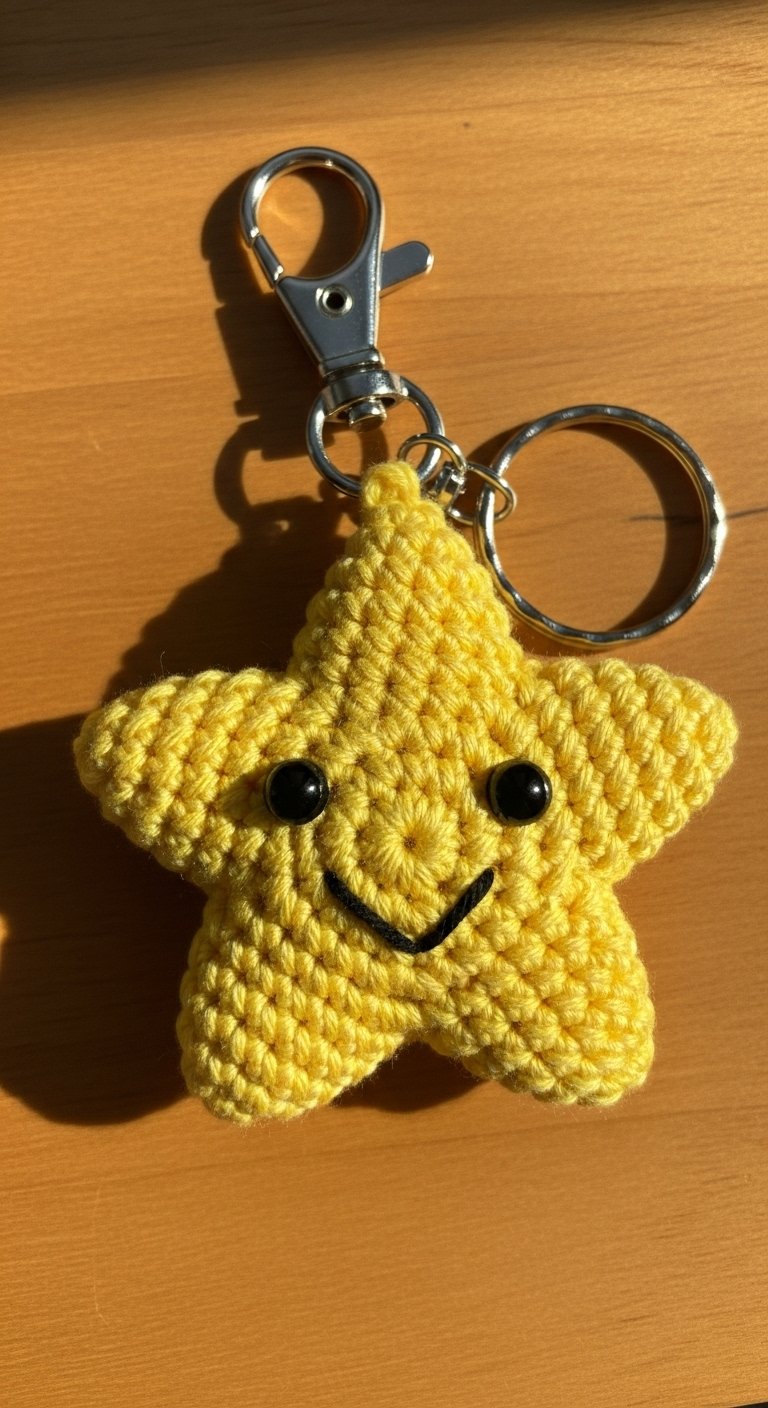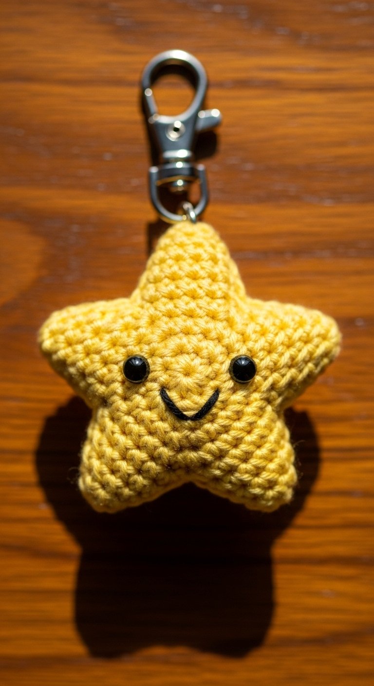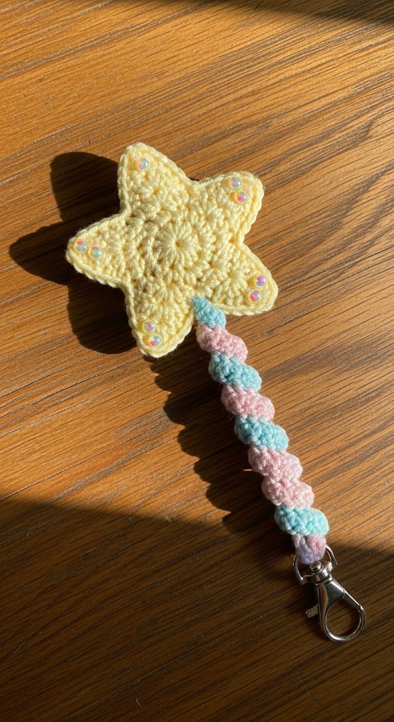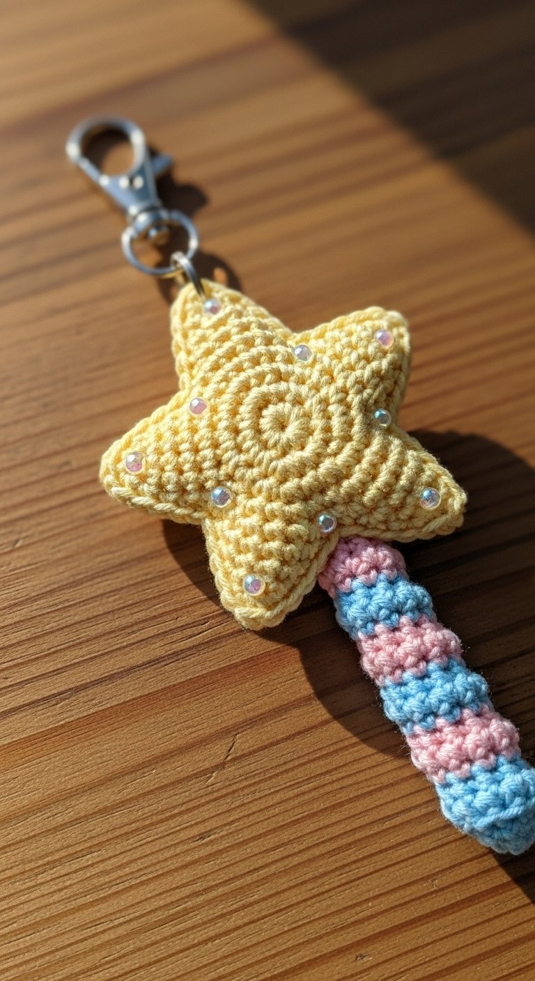 This is a unique shape for a keychain, featuring a star atop a slim handle. It is perfect for anyone who loves fantasy or wants a reminder of their inner magic. The star is usually crocheted in yellow or gold yarn, perhaps with a strand of metallic thread running through it for sparkle.