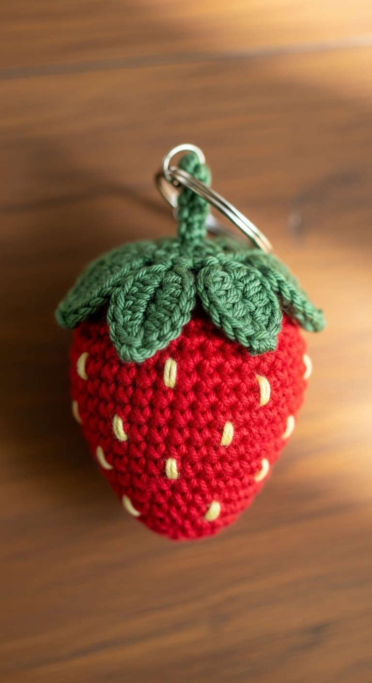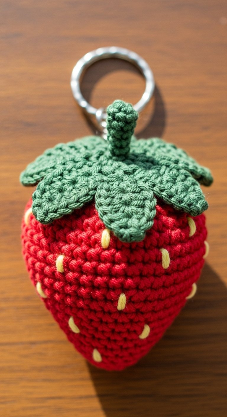 This is often cited as the most “aesthetic” fruit to crochet. The shape is a tapered cone, worked in red or pink, with green sepals on top. You can embroider tiny white or yellow seeds on the body.