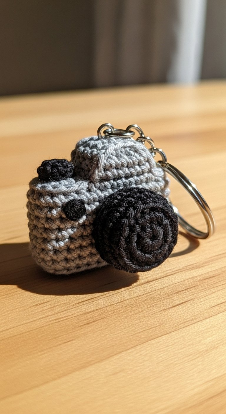 The lens detail often involves a “surface slip stitch” or embroidery to create the shutter look. It feels sturdy and substantial on a keyring, acting as a cool, hipster-chic statement piece. It is a bit more complex than the bee, but the result is a sophisticated miniature that looks great on a camera bag or backpack.
